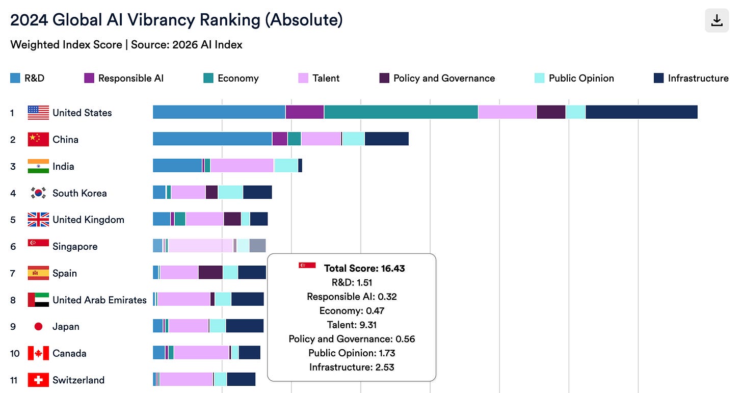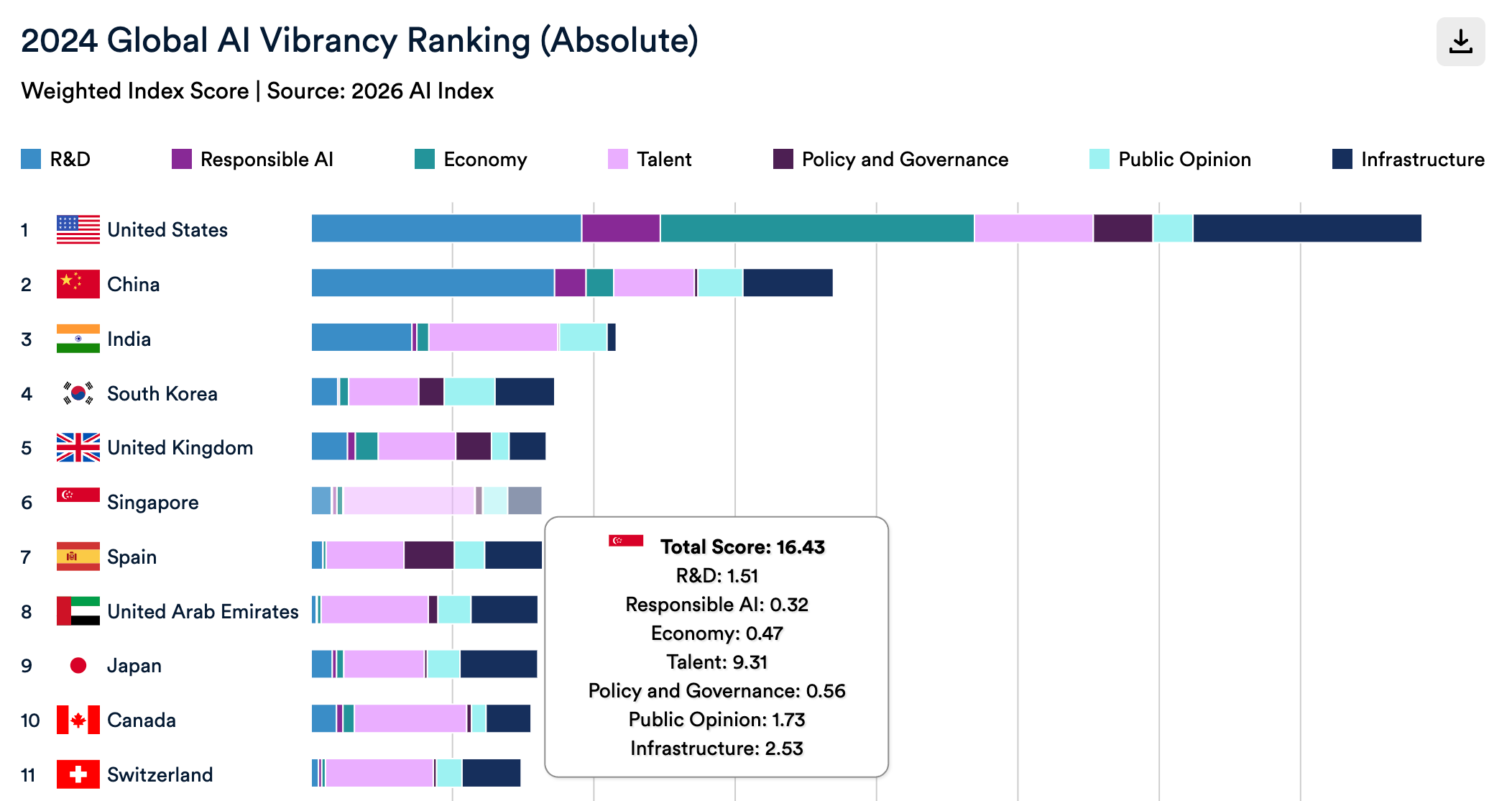스탠포드 HAI에서 집계하고 있는 글로벌 AI 파워 순위를 보면 그나마 싱가포르가 주변국의 인재들을 흡수해서 2024년 기준 6위에 들었지만, 그 외 R&D나 Economy등의 부분에서는 약한 모습을 볼 수 있습니다. 그나마 싱가포르를 제외하면 26위에 말레이시아가 있고, 나머지 국가들은 36위 밖에 있습니다.