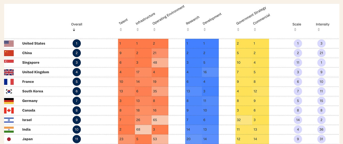 Tortoise Media의 Global AI 인덱스를 보면 싱가포르의 순위가 3위까지 올라가긴 합니다. 글로벌 IT 대기업들의 APAC 지사도 많고, 현재 싱가포르에 유동성이 넘쳐나서 가능한 현상이 아닌가 합니다. 뭐 이런 통계를 들지 않더라도 LLM을 기준으로 볼 때 미국 중국을 제외하면 프랑스의 Mistral의 Mixtral정도밖에 글로벌 네임밸류와 깊이가 있는 프로젝트가 없습니다.