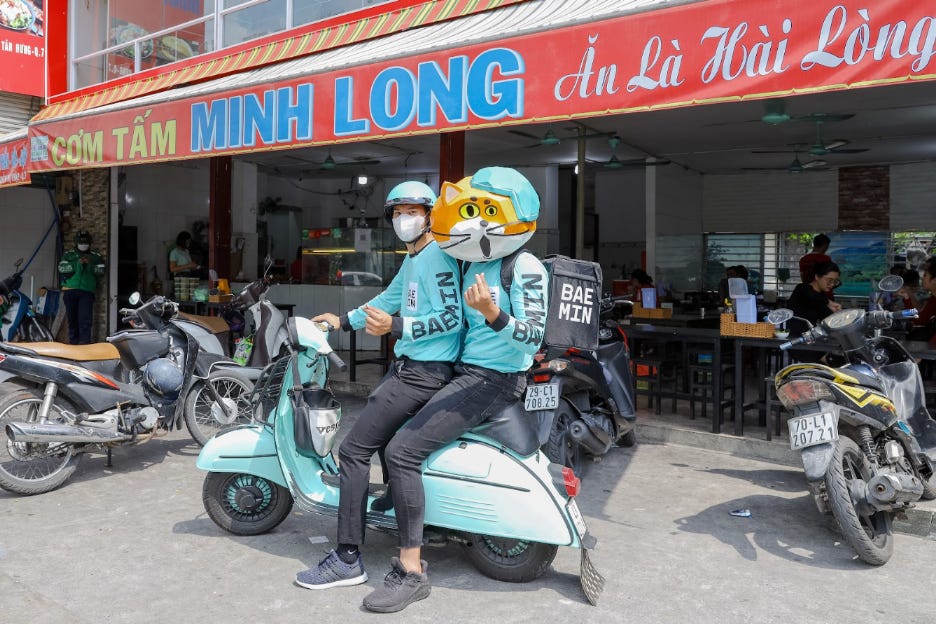 그랩은 동남아시아 어디를 가도 쓸 수 있는 라이드 헤일링 앱이에요. 말레이시아에서 시작해 싱가포르의 러브콜로 본사를 옮겨, 현재는 싱가포르 회사로 알고 있는 사람들이 더 많죠. 베트남에서 배달에 쓰이는 차량은 역시 오토바이고, 오토바이 라이더들을 가장 많이 가진 곳 역시 그랩입니다. 2022년 기준 약 200,000명의 드라이버 중 약 50%가 그랩을 사용하고, 그중 대다수는 오토바이죠. 그랩은 압도적인 라이더 인프라를 이용해 라이드 헤일링 뿐 아니라 음식 배달, 소매점들과의 연결을 통한 퀵커머스 등 여러 서비스를 제공하고 있는 슈퍼 앱이에요.