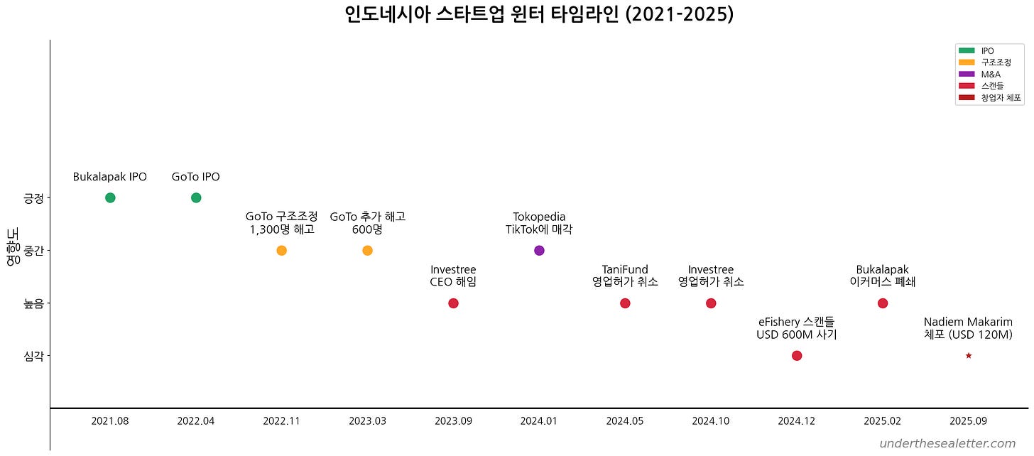 지난 뉴스레터에서는 인도네시아의 스타트업 윈터가 어떻게 오게 되었는지를 알아봤습니다. 펀딩의 감소, 스타트업들의 스캔들, 그리고 유니콘들의 주가 폭락이 연쇄적으로 인도네시아의 스타트업 윈터를 뼈까지 시린 겨울로 만들어버렸죠.