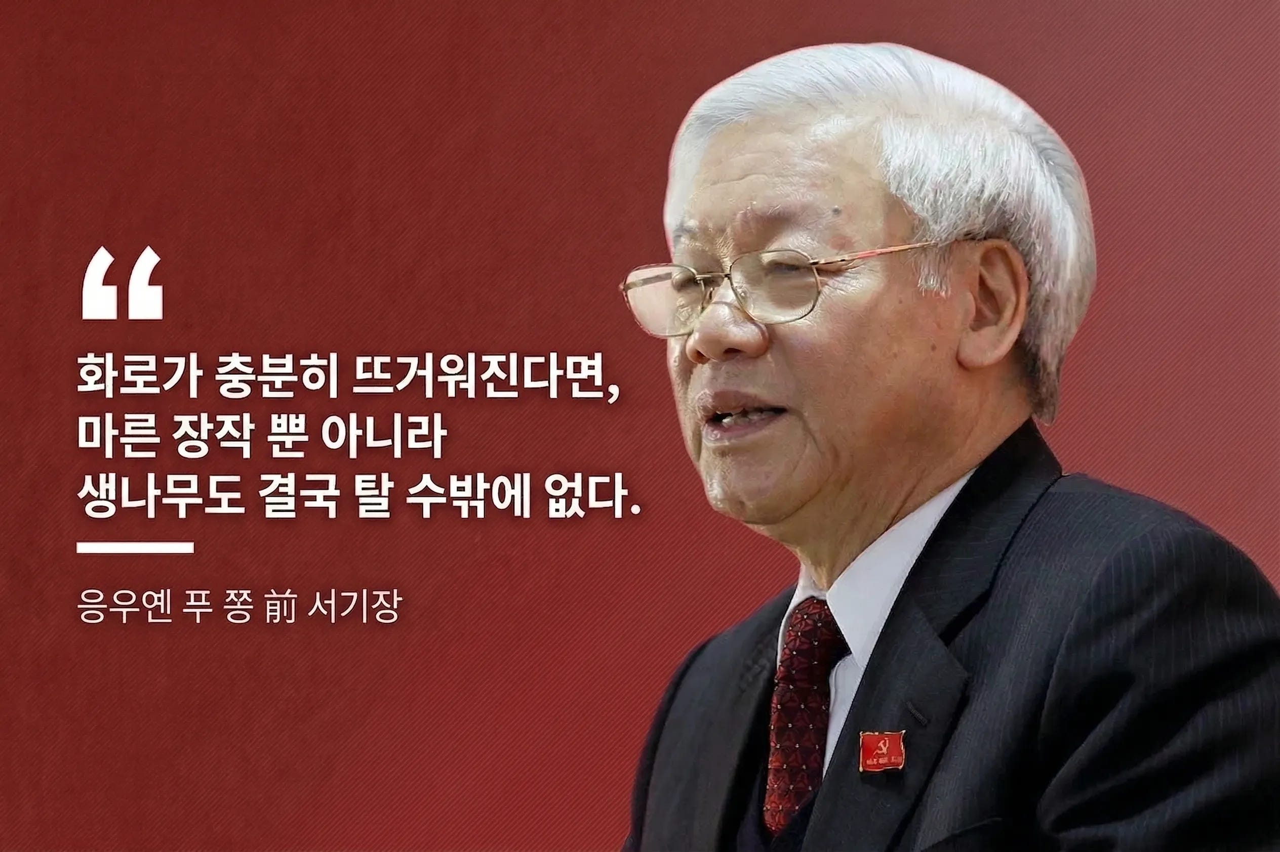 여기서 화로(Lò)는 반부패 시스템 자체를 뜻하고, 마른 나무는 비리가 너무나 명백해서 바로 잡을 수 있는 관료, 생나무는 고위직이라 건드리기 어려웠던 대상을 가리킵니다. 결국 이러한 비유를 통해서 故 응우옌 푸 쫑 前 서기장은 직급이 아무리 높아도, 비리가 아무리 오래 전 일이어도, 당국의 발전을 위해 예외 없이 관련자를 처벌하겠다고 공언한 셈이지요. 더하여, 이렇게 화로를 충분히 뜨겁게 만들어서 베트남 사회 전체가 투명하고 청렴함을 추구할 수 있도록 분위기를 조성하겠다는 의지가 담긴, 정말로 멋진 비유였습니다.