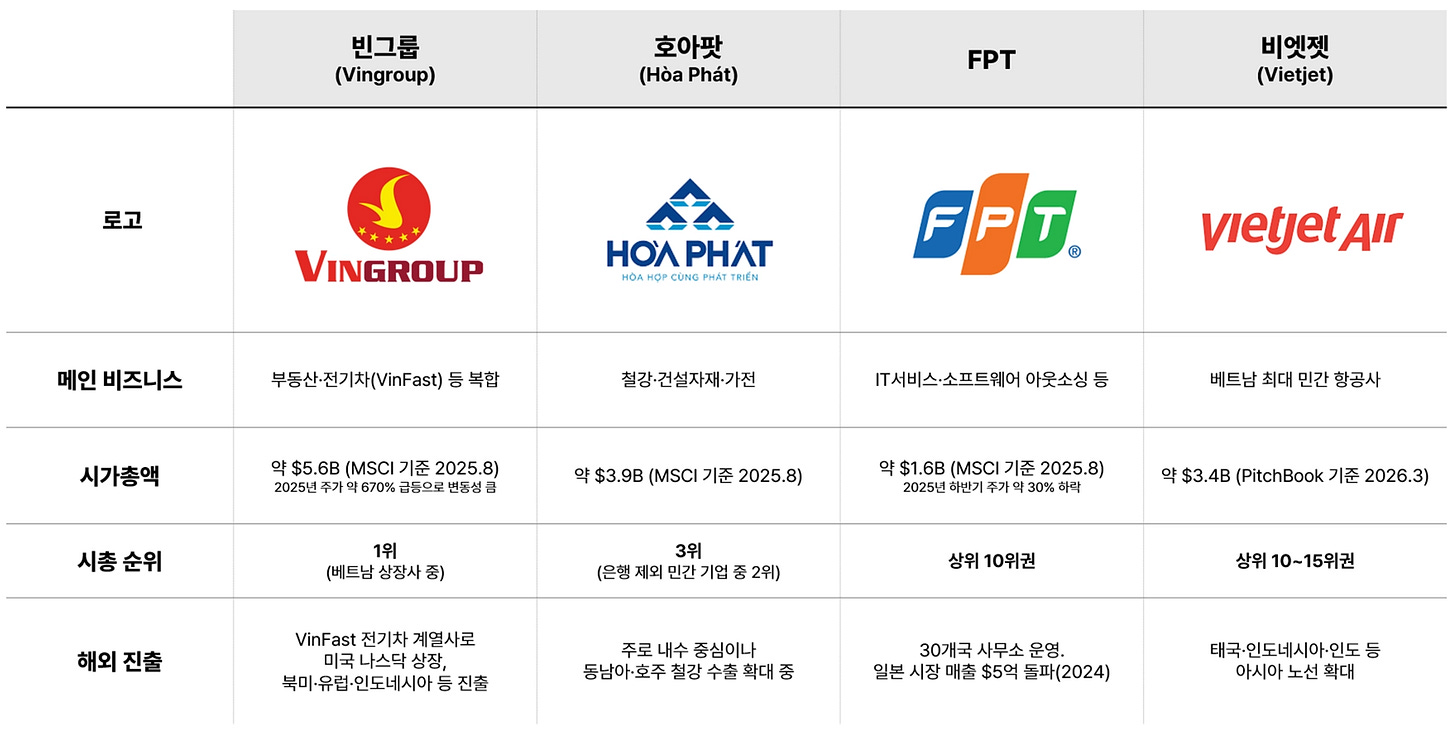현재 가장 유력한 후보군은 호아팟(Hòa Phát, 철강), 빈그룹(Vingroup, 복합), 비엣젯(Vietjet, 항공), FPT(IT) 같은 기업들입니다. FPT는 2024년 해외 IT 서비스 매출 급증에 힘입어 총매출 약 24.7억 달러를 기록했고 비엣젯은 같은 해 전년 대비 47% 성장이라는 실적을 찍었습니다. 이미 글로벌 무대에서 차츰 실력을 증명해 보이고자 하는 기업들이고, 정부 정책에 적극 호응하며 덩치를 키우고 있습니다.