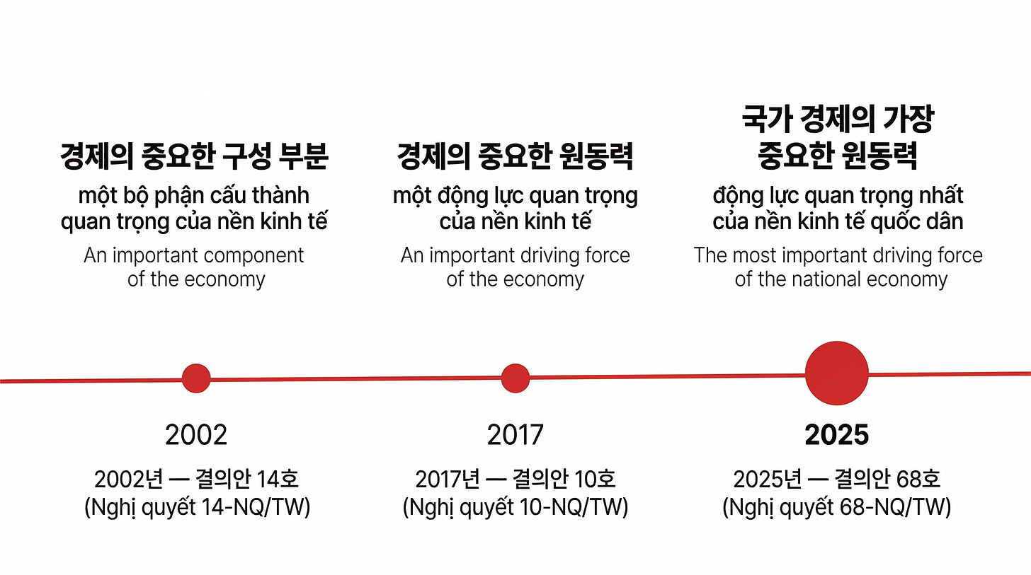 2025년 5월 4일, 또럼 서기장이 서명한 결의안 68호(Resolution 68-NQ/TW)는 도이머이 이후 베트남이 민간경제를 다룬 공식 문건 중 가장 파격적인 것으로 평가받습니다. 베트남 당국이 그동안 민간경제에 대해 어떻게 서술해 왔는지 그 변화를 한번 짚어보겠습니다.