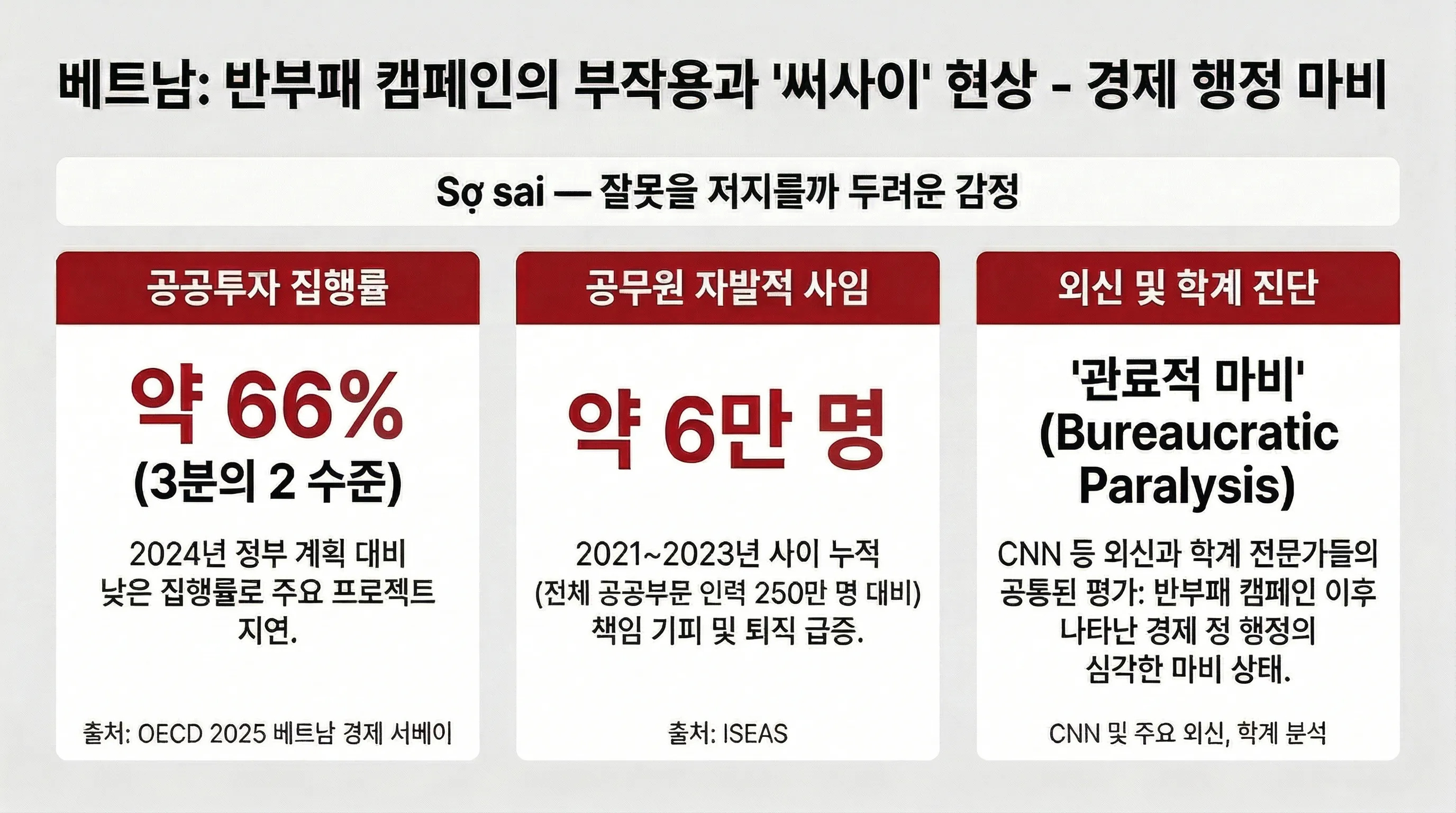 숫자를 보면 그 규모가 선명해집니다. OECD의 2025년 베트남 경제 서베이에 따르면, 2024년 베트남의 공공투자 집행률은 정부 계획의 3분의 2 수준에 머물렀습니다. 2021년부터 2023년 사이에는 공무원 6만 명이 자발적으로 사임했는데, 이는 전체 공공부문 인력 250만 명 규모를 감안하면 상당한 숫자입니다. CNN 등 외신이나 학계 전문가들은 이 상태를 ‘관료적 마비’라는 표현으로까지 진단했습니다.