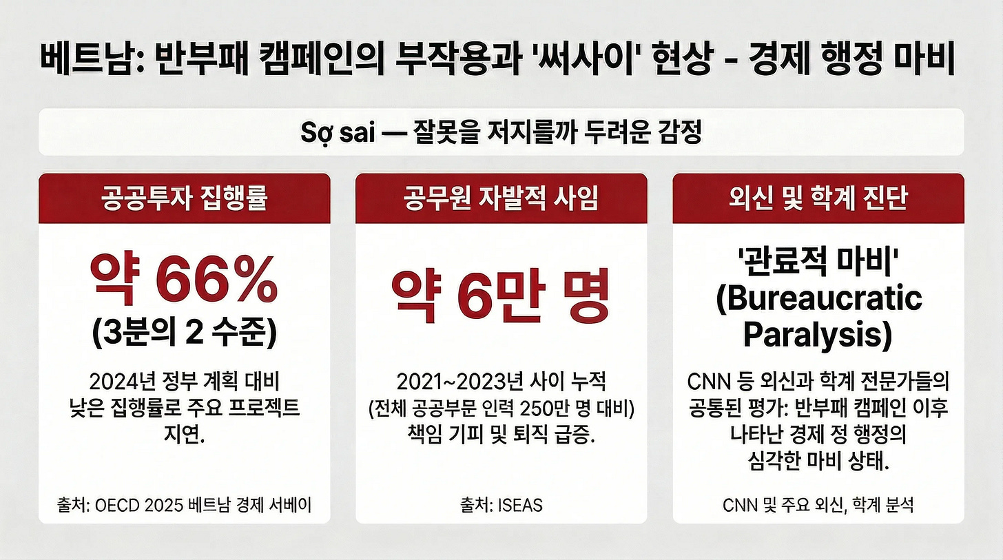 베트남어로 ’써사이(Sợ sai)’라는 표현이 있습니다. 직역하자면 ‘잘못을 저지를까 두려운 감정’입니다. 대규모 부패 척결 캠페인이 수년간 계속되면서 관료들 사이에 “괜히 결재 도장 찍었다가 나중에 처벌받으면 어쩌지?”라는 공포가 퍼졌습니다. 인허가 서류에 서명하는 것 자체를 기피하는 분위기가 관료 사회 전체에 확산된 거예요.