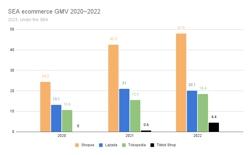 2022년까지의 동남아시아 주요 이커머스 플레이어들의 GMV(Gross Merchandise Value, 거래량)을 보면 틱톡이 전체 시장의 약 4.5% 정도의 마켓쉐어를 빠르게 가져가며 꽤 봐줄 만하게 성장하는 것을 확인할 수 있습니다만, 오히려 전체 시장의 파이가 커지면서 쇼피(Shopee)의 거래량이 엄청 빠르게 성장하고, 인도네시아 내에서만 서비스하는 토코피디아(Tokopedia)가 동남아시아 여러 국가를 상대로 서비스하는 라자다(Lazada)와 겨루는 모습을 볼 수 있습니다.